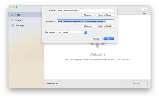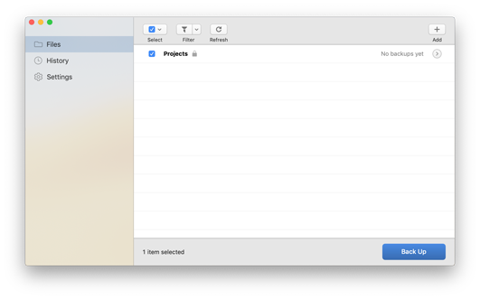 Alternatively, use the Add button in the top-right corner to pick a file or folder to back up.