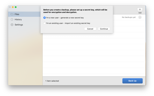 If you're using the app for the first time, and have no existing backups, select the option to create a new key.